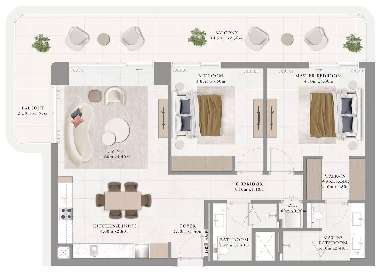 The property sizes measure from 814 sq. ft to 1,926 sq. ft. Residents will appreciate spacious living rooms, open-plan kitchens, walk-in wardrobes in the bedrooms, and spacious terraces with stunning waterfront views. The layouts include one or more balconies and a laundry room, while 3-bedroom apartments are additionally complemented with a utility room.
