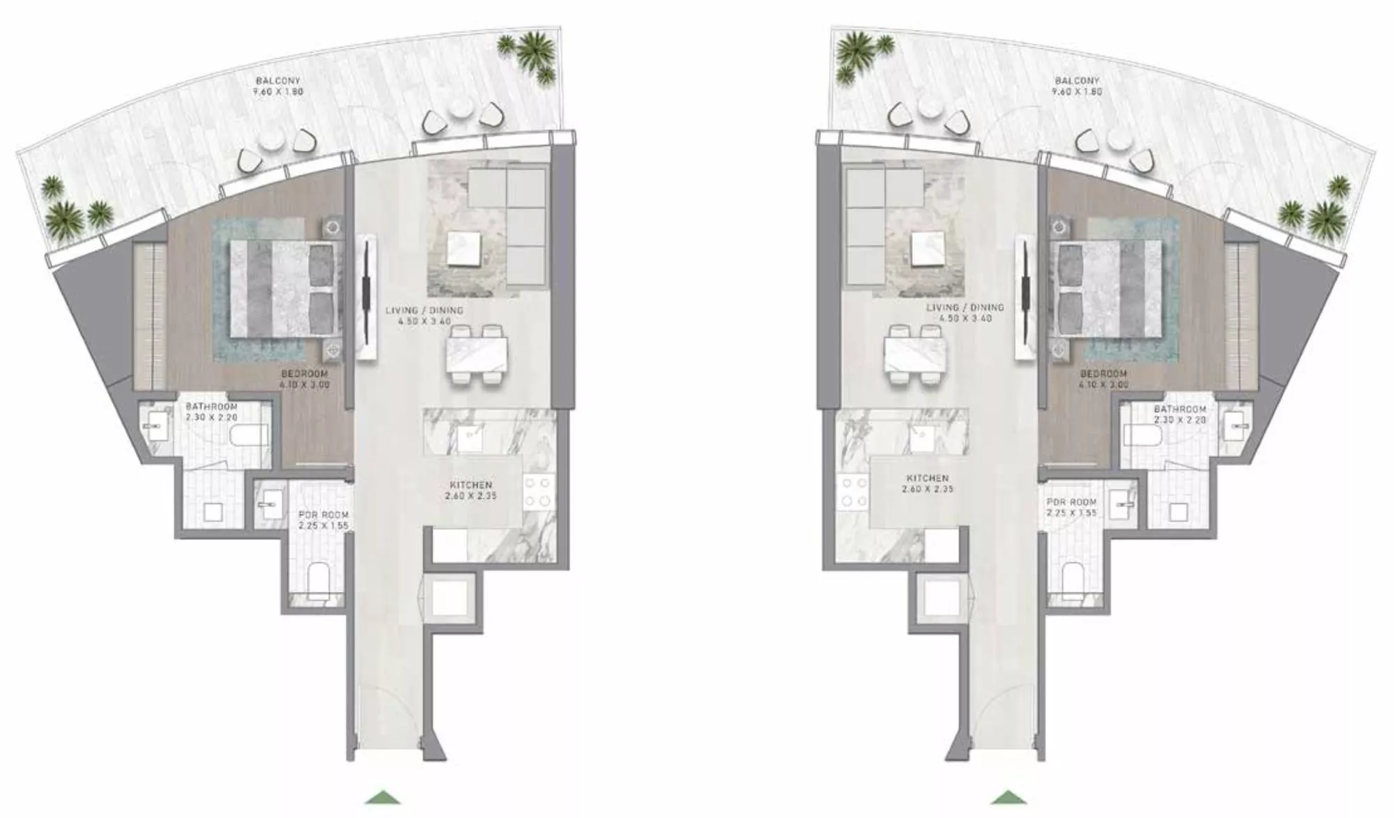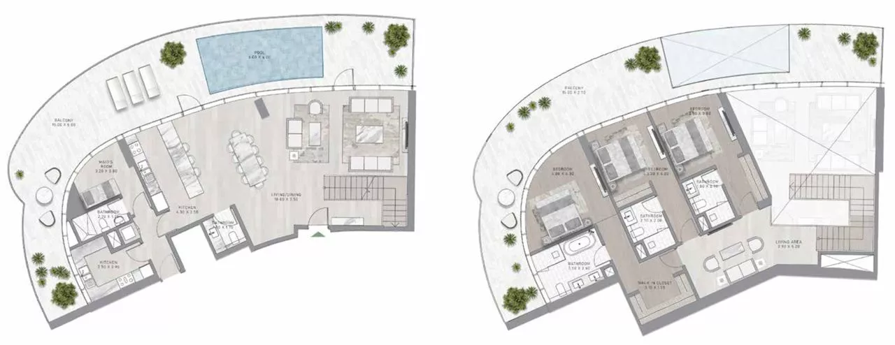 In terms of the layouts, each property will have a rounded balcony overlooking the Dubai Water Canal or the famous Burj Khalifa. At the same time, duplex owners will have a walk-in closet in the master bedroom, a maid’s room and a private swimming pool on their balcony.