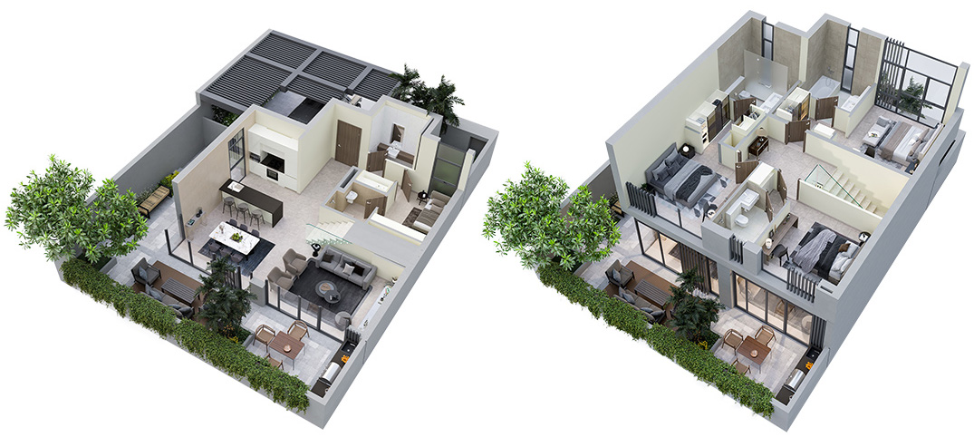 - Two-bedroom townhouses with rooftop terraces: are perfect for small families or individuals seeking the comfort of a house with the convenience of an apartment.
