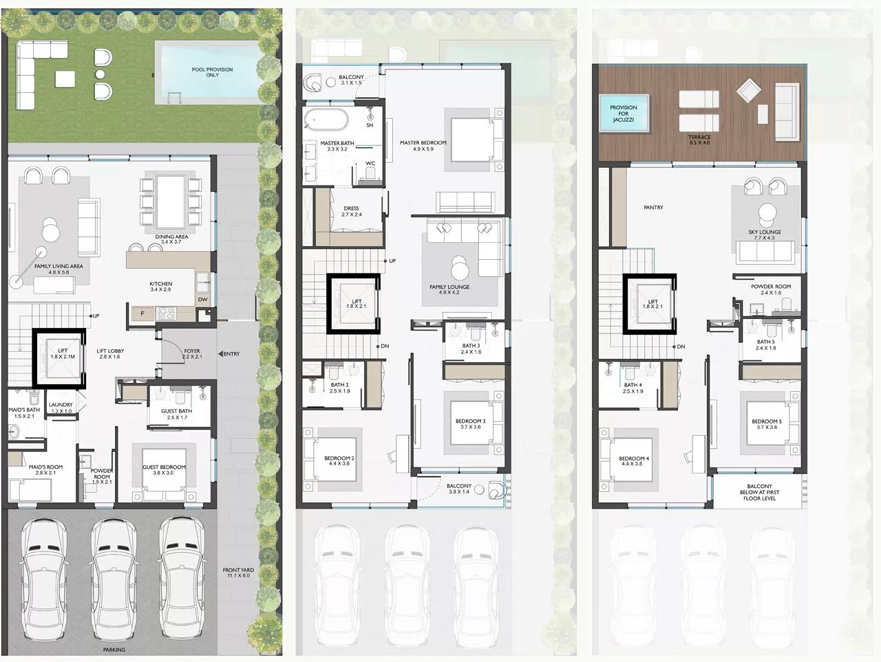 You have the privilege of choosing from a total of 84 six-bedroom standalone and twin villas, as well as six-bedroom townhouses, all boasting breathtaking views of the lush greenery. These properties offer spacious living areas ranging from 4,671 sq. ft to 8,032 sq. ft.