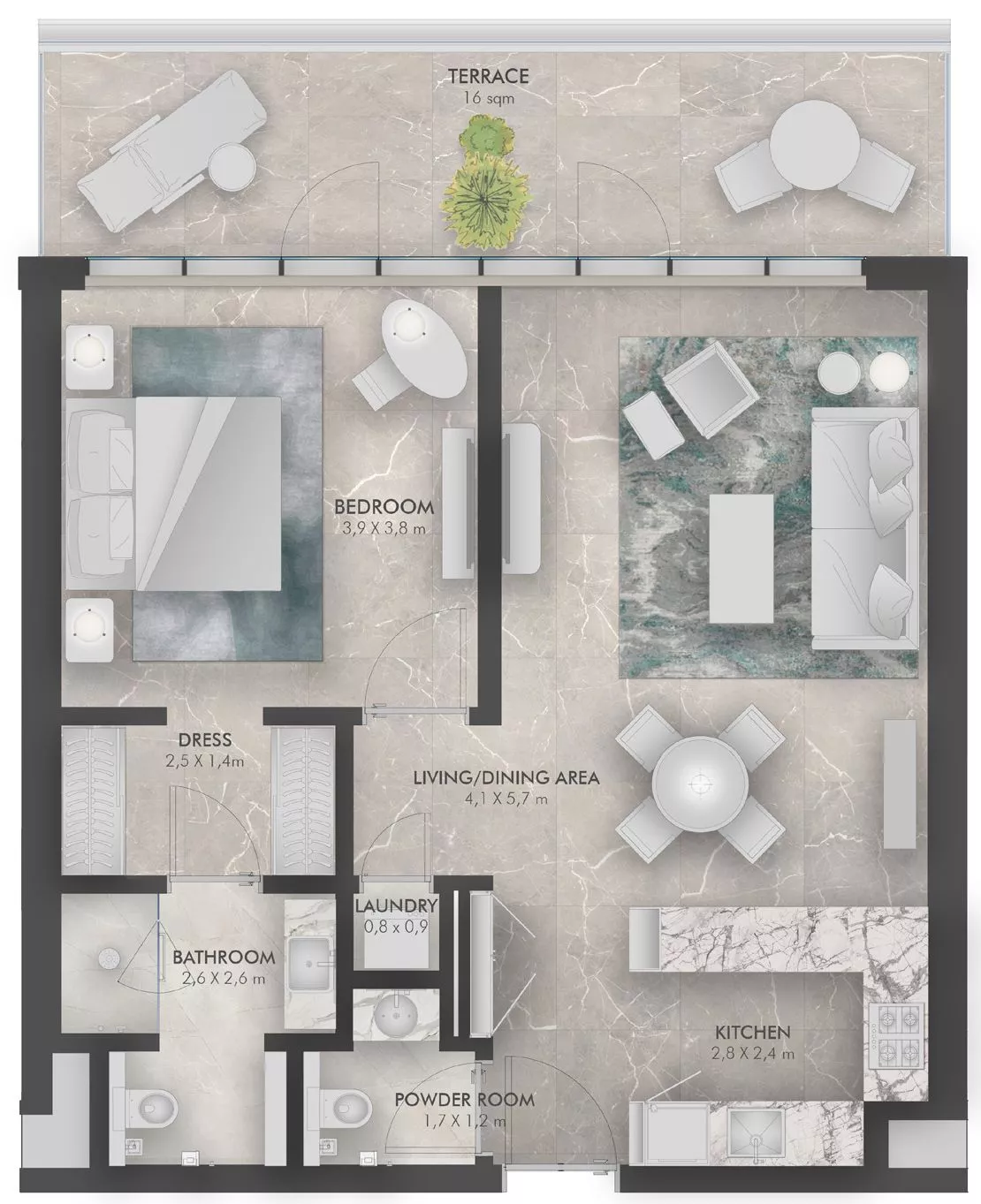 The property sizes range from 889 sq. ft to 2,421 sq. ft. Each apartment comes with a private terrace, whilst select 2-bedrooms and all 3-bedrooms will additionally be equipped with a maid’s room. The kitchens will boast premium European appliances, such as a fridge, a dishwasher, an oven, and a hob.