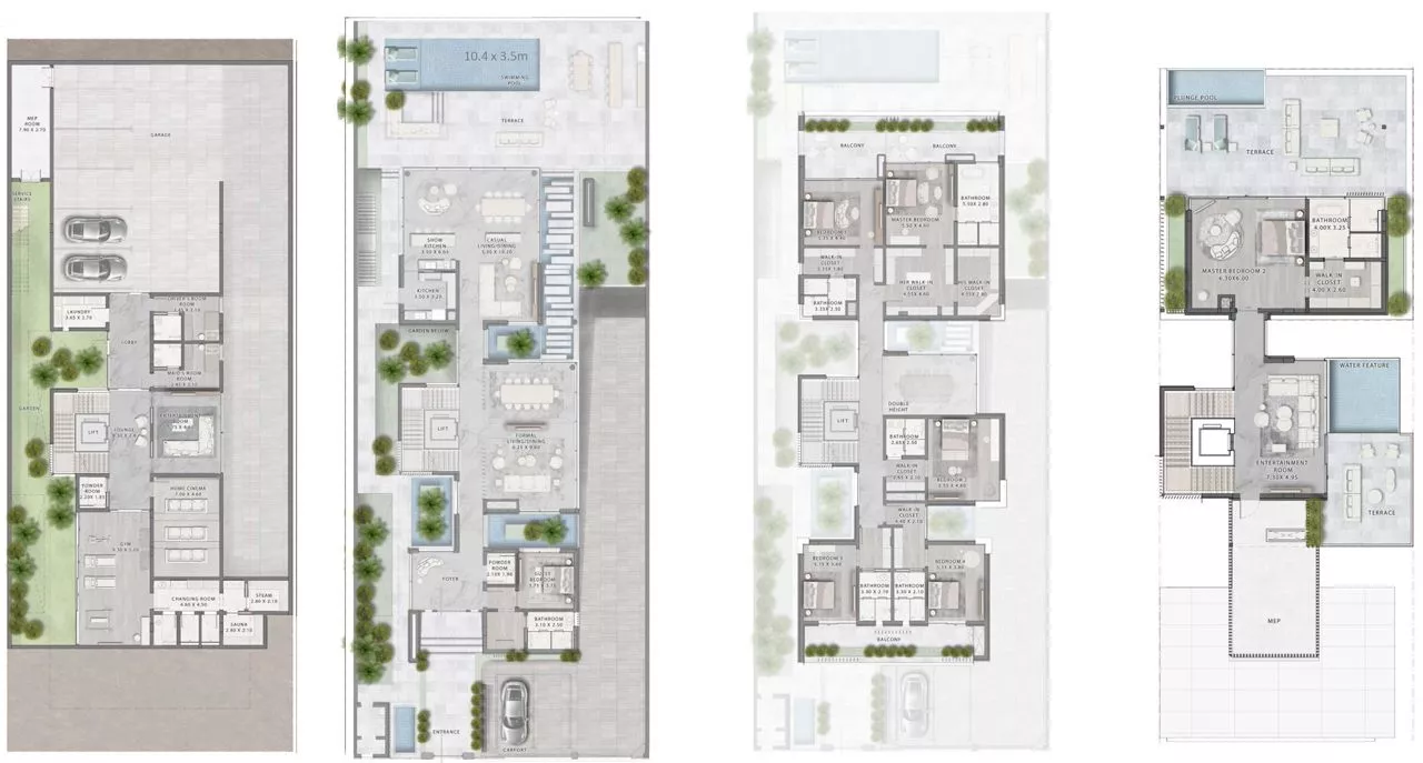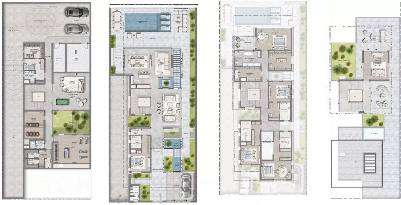 Among the key features of the layouts are an entertainment room, steam & sauna rooms, a gym, a parking area, a spa, a swimming pool, a cinema, a BBQ area, a terrace, a rooftop garden and more. For the utmost convenience of homeowners, the kitchens are fitted with cabinets and under-counter storage with stone countertops.