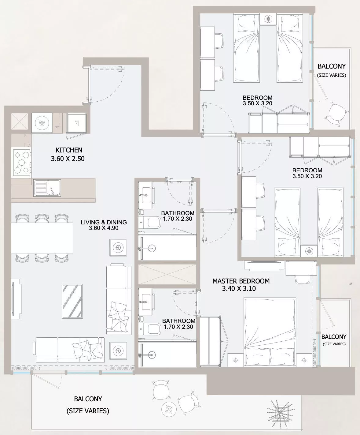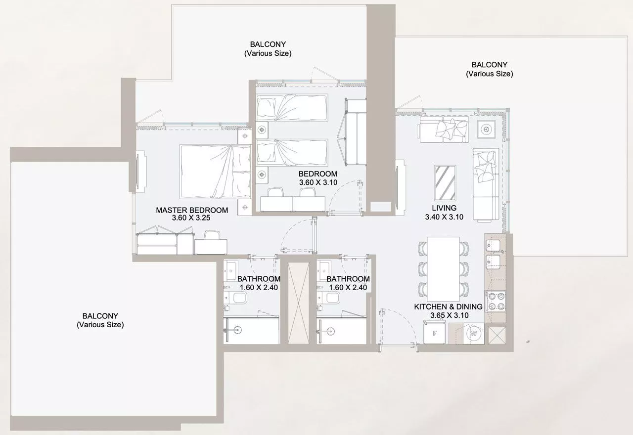 There are 6 podium levels and 39 residential storeys in the skyscraper. The total number of residences in the complex constitutes 622, which are presented by 1–5 bedroom apartments and 3–4 bedroom penthouses. Units come unfurnished and every property offers double-glazed windows and balconies or terraces. Living areas of real estate vary from 495 sq. ft to 3,019 sq. ft.
